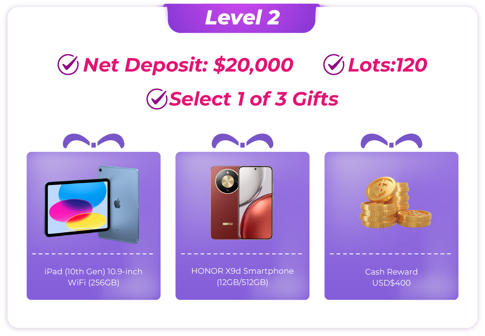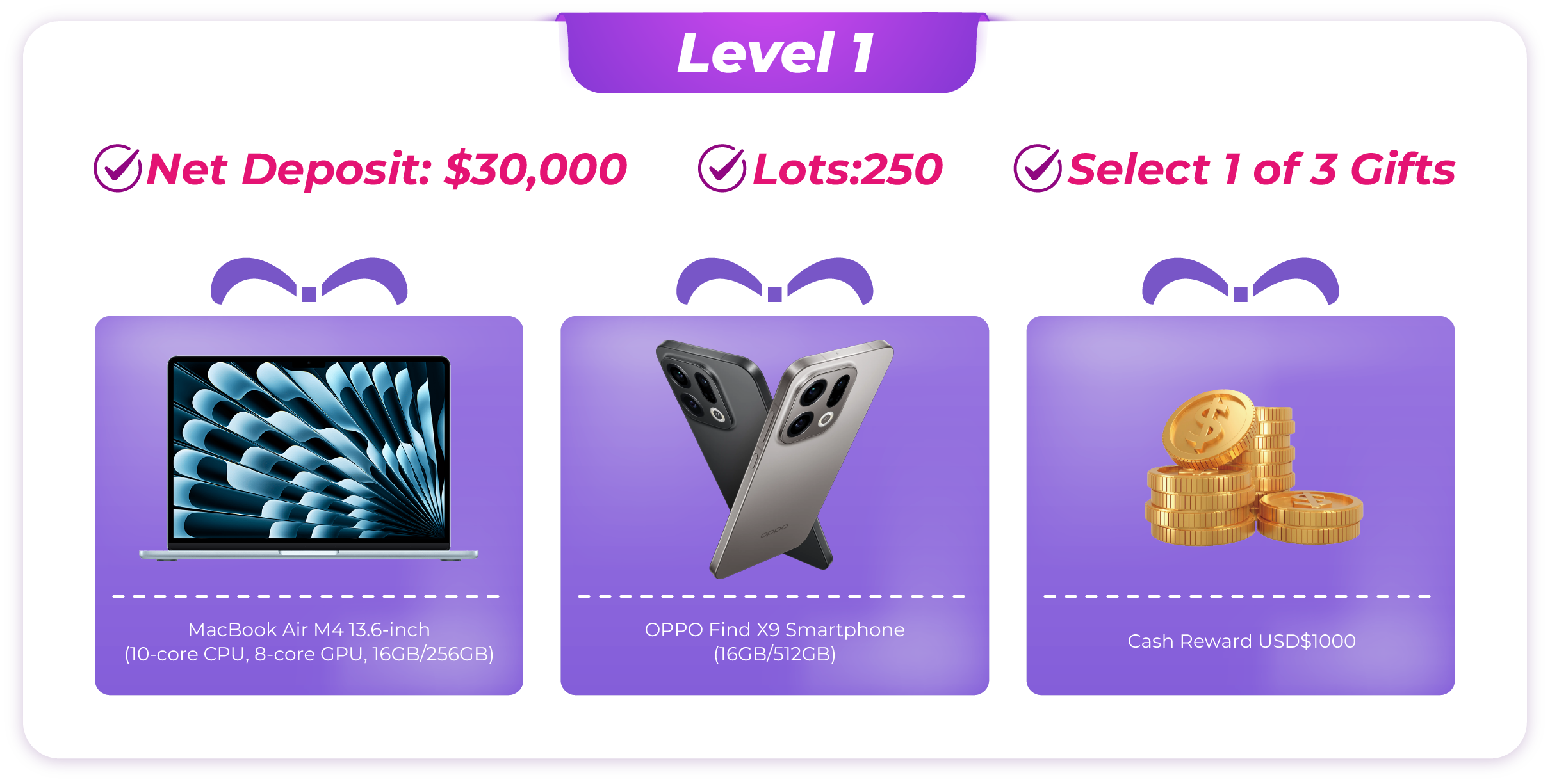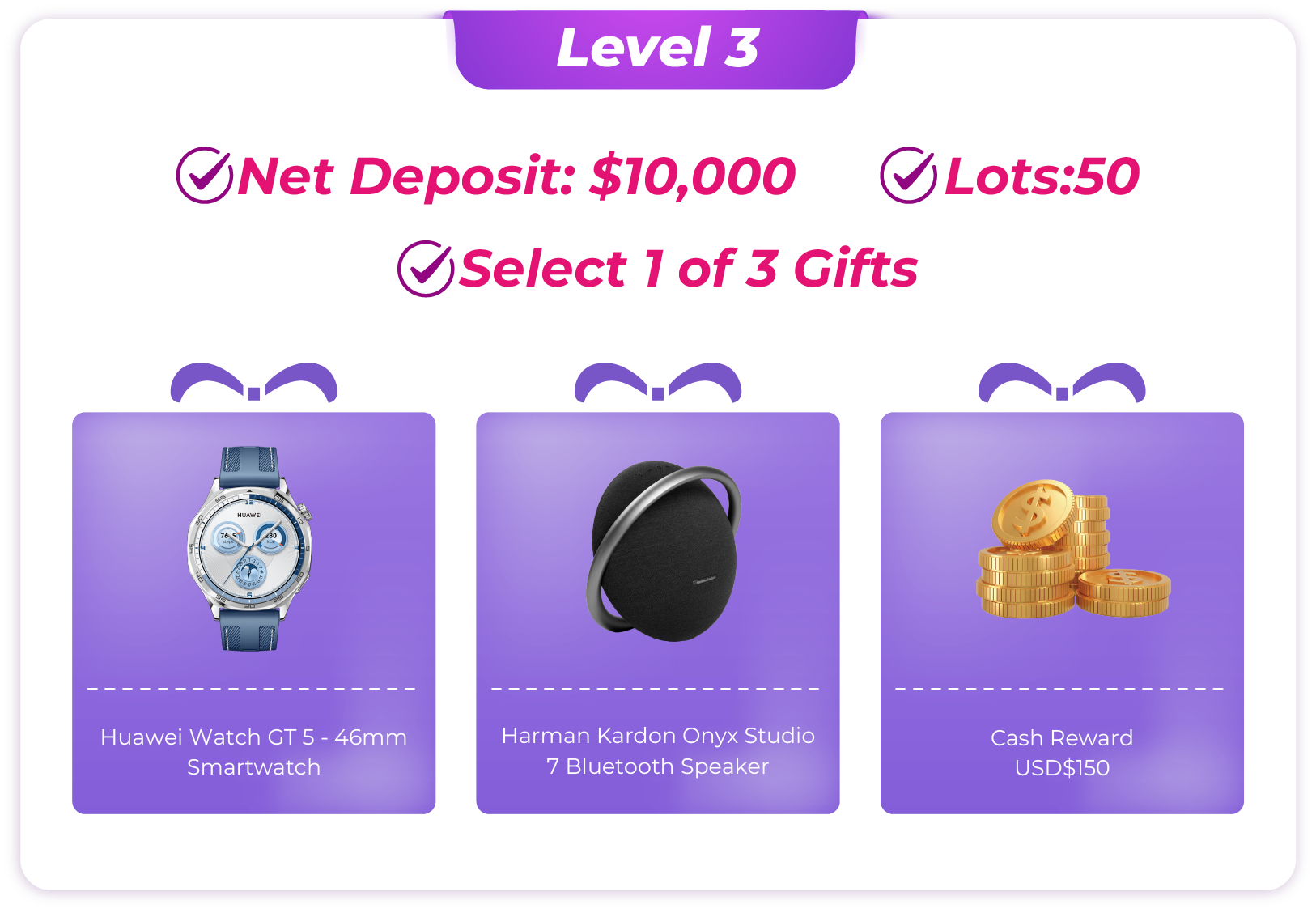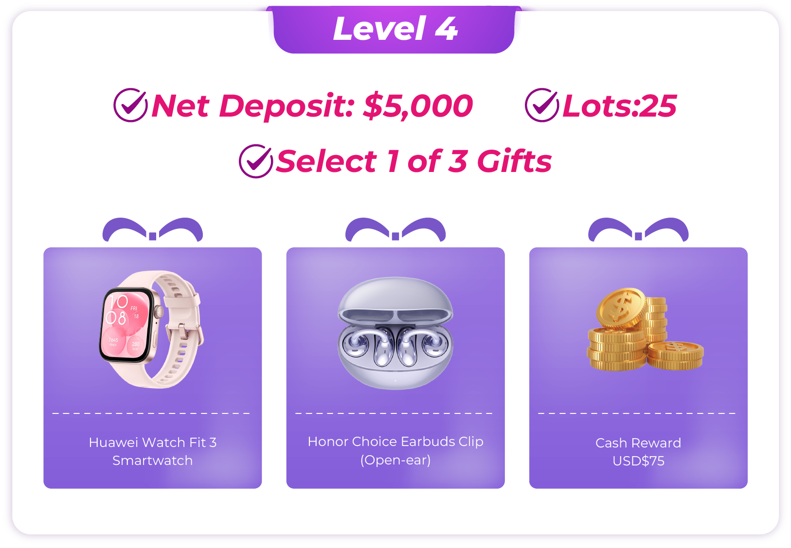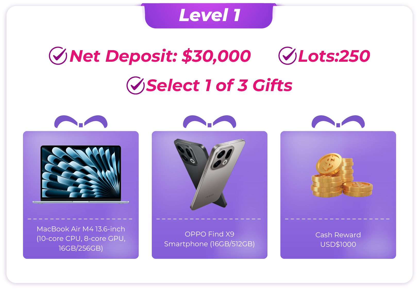 · Note: Internal transfers between trading accounts are not counted as deposits. - Account Calculation: If a client holds multiple accounts, the rewards will be calculated based on the single account that qualifies for the highest reward level. Trading volumes from different accounts cannot be combined.