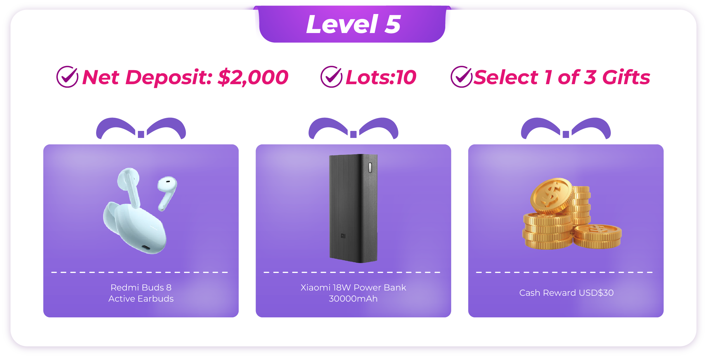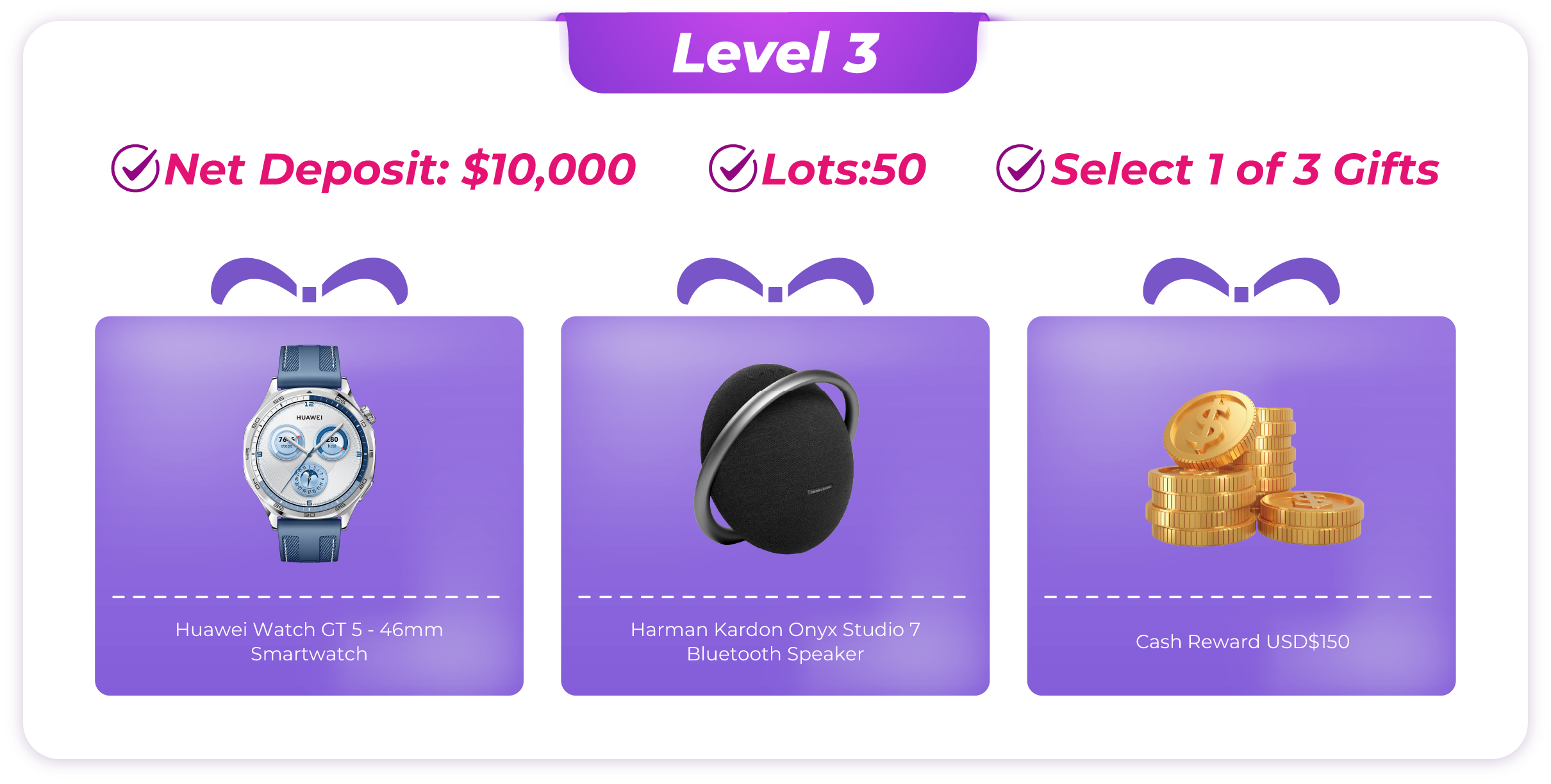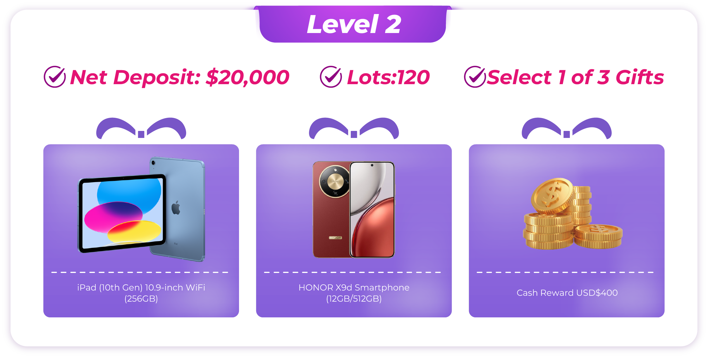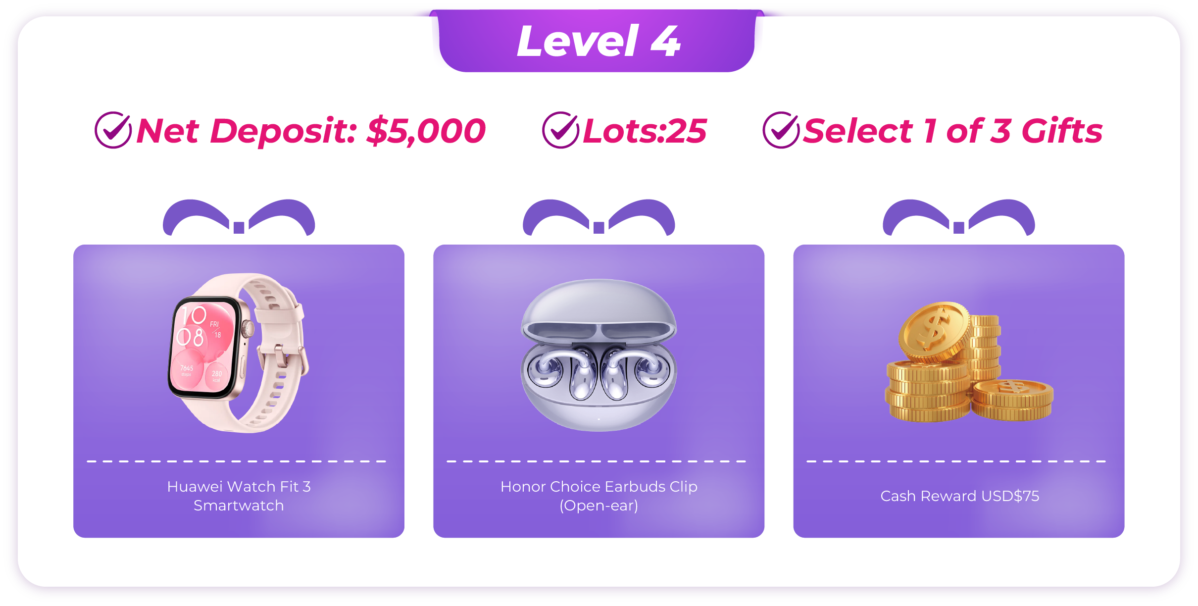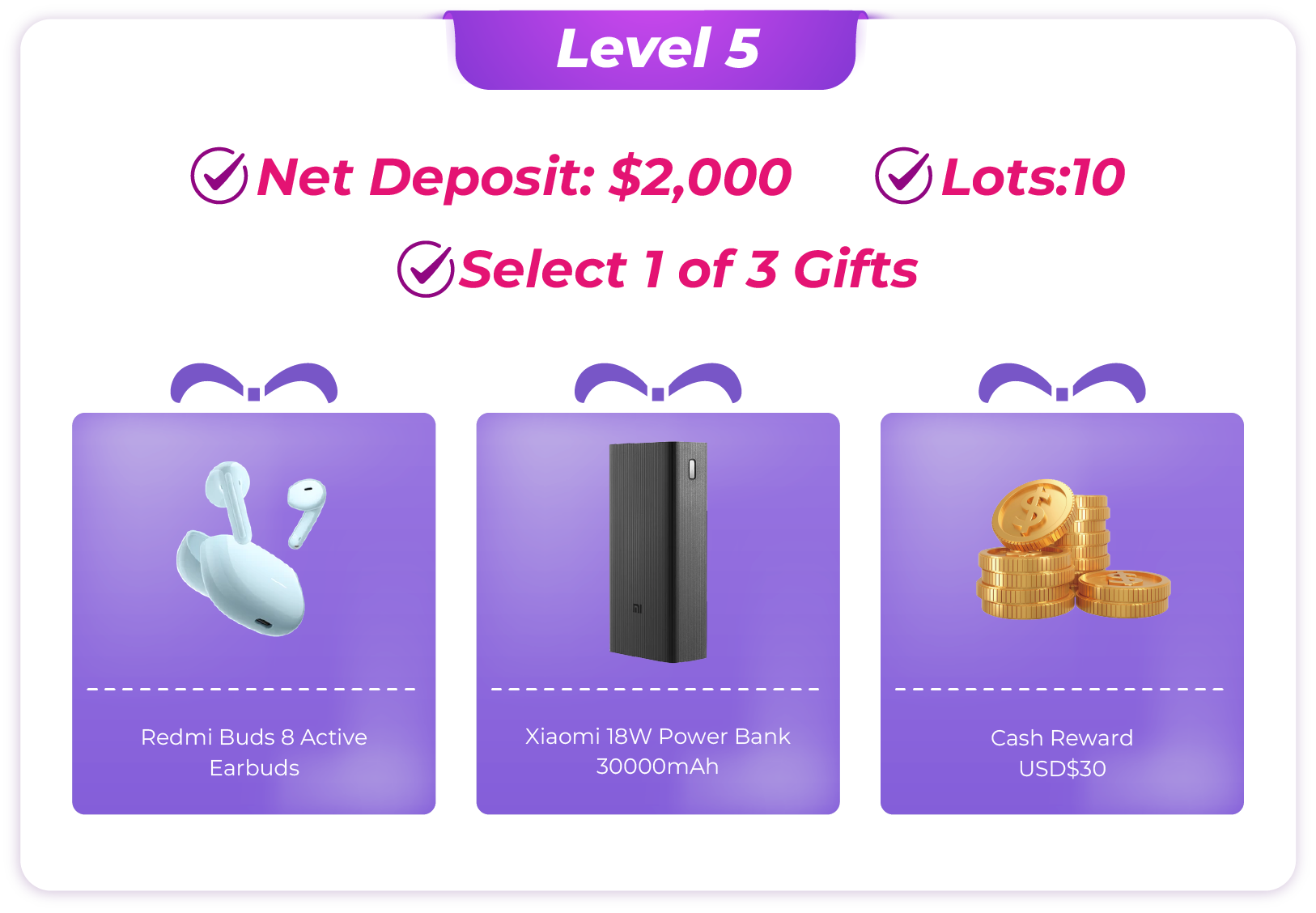 · Note: Internal transfers between trading accounts are not counted as deposits. - Account Calculation: If a client holds multiple accounts, the rewards will be calculated based on the single account that qualifies for the highest reward level. Trading volumes from different accounts cannot be combined.